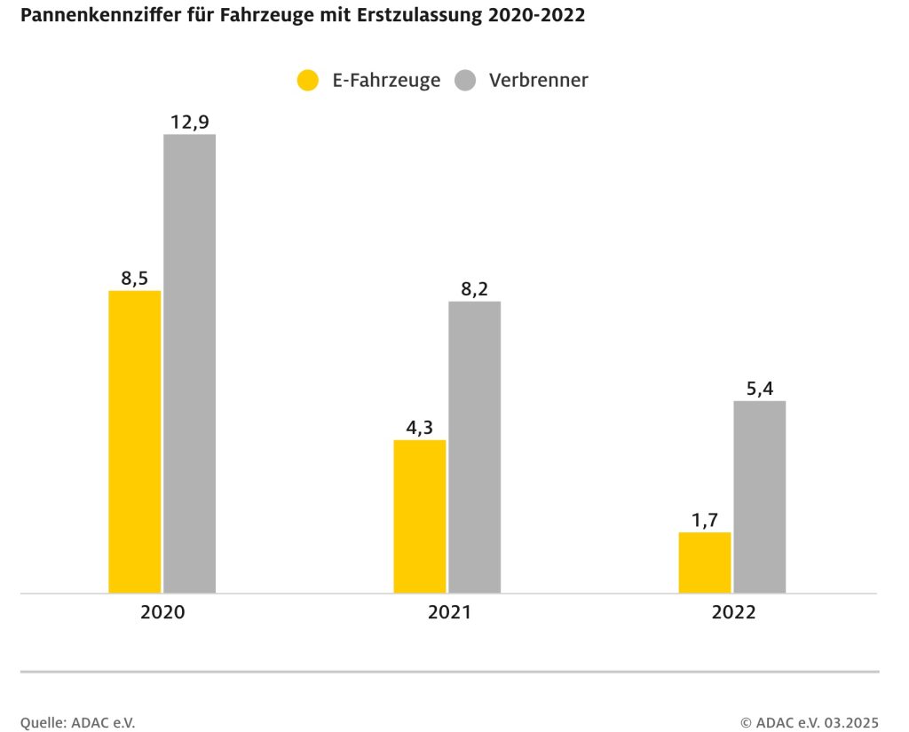 Het Duitse ANWB Wegenwacht-equivalent, de ADAC, heeft de ‘Pannenstatistik 2025’ uitgebracht. Daarin staan cijfers over het aantal pechgevallen op de Duitse wegen en geeft inzicht in de betrouwbaarheid van verschillende voertuigmodellen en vergelijkt de prestaties van elektrische voertuigen (EV’s) met die van traditionele verbrandingsmotoren.