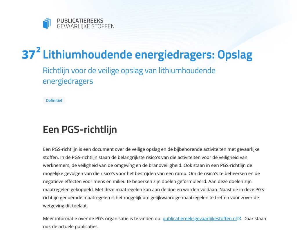 De Publicatiereeks Gevaarlijke Stoffen (PGS) is een verzameling richtlijnen die zijn opgesteld om de risico’s bij het omgaan met gevaarlijke stoffen beheersbaar te maken. Eén van de nieuwste toevoegingen aan deze reeks is PGS 37-2, een richtlijn die specifiek ingaat op de veilige opslag van lithiumhoudende energiedragers zoals accu’s en batterijen. De definitieve versie van deze richtlijn wordt in de loop van 2025 verwacht. De richtlijn sluit aan bij de ‘Nieuwe Stijl’ binnen de PGS-systematiek, waarbij risicobenadering centraal staat.